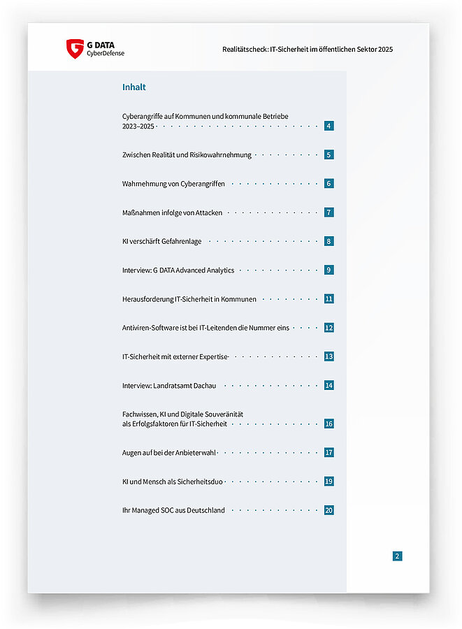 45 % der Mitarbeitenden im öffentlichen Sektor haben bereits einen Cyberangriff miterlebt oder von Kollegen davon gehört. Doch welche Faktoren führen dazu, dass die Angreifer so erfolgreich sind? Welche Strategien verfolgen deutsche Behörden, Landkreise und öffentliche Einrichtungen, um sich zu schützen – trotz Fachkräftemangel und knappen Budgets? Dazu haben wir mit Statista und brandeins eine großangelegte Umfrage durchgeführt. Holen Sie sich jetzt Ihren Wissensvorsprung und erfahren Sie im Paper: